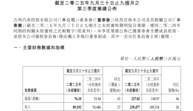 吉利汽车:第三季度归属于上市公司股东的净利润为38.2亿元,同比增长59%