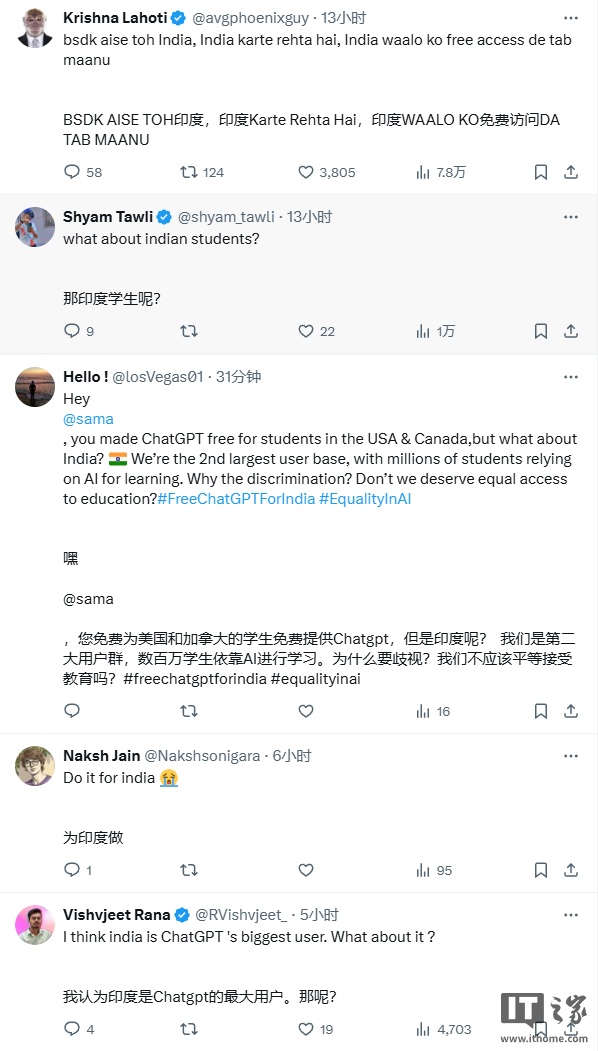 值得一提的是,在他这条 X 文下方还有大量印度用户抱怨不公平,希望 OpenAI 能做到一视同仁,但奥尔特曼没有任何回应。