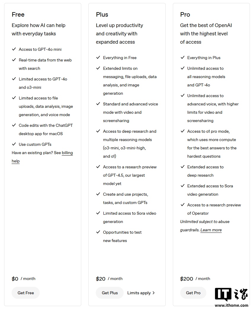 目前 OpenAI 为 ChatGPT 提供了多种付费订阅选项,基础的 ChatGPT Plus 每月付费 20 美元,Pro 选项每月 200 美元(IT之家注:现汇率约合 1458 元人民币)。