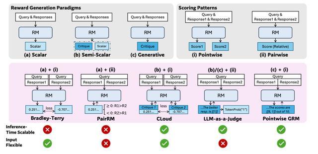 现有奖励模型范式,如标量评分(Scalar RM)或成对比较(Pairwise RM),在通用性和灵活性上存在局限。同时,随着推理时缩放(增加推理计算量)越发成为一个性能提升的重要途径,如果奖励模型能在推理时通过更多计算变得更准确,将直接提升 LLM 的对齐效果。