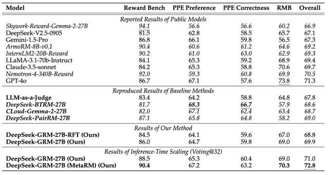 实验结果清晰地展示了该研究方法的有效性:首先,即使在不进行推理时间缩放的基础设置下,经过 SPCT 训练的 DeepSeek-GRM 模型在整体性能上已优于同等规模的多种基线奖励模型,并展现出与一些大型闭源模型相竞争的实力。