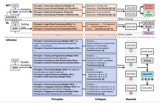 二是推理时缩放潜力。由于模型的核心行为是生成文本,因此在推理时进行多次采样变得非常自然且有意义。每次采样可能产生不同的评价原则侧重和批判分析角度。通过综合这些多样化的评价结果,有望获得比单次生成更全面、更鲁棒、更精细的最终评分,为利用推理计算提升奖励质量提供了可能。