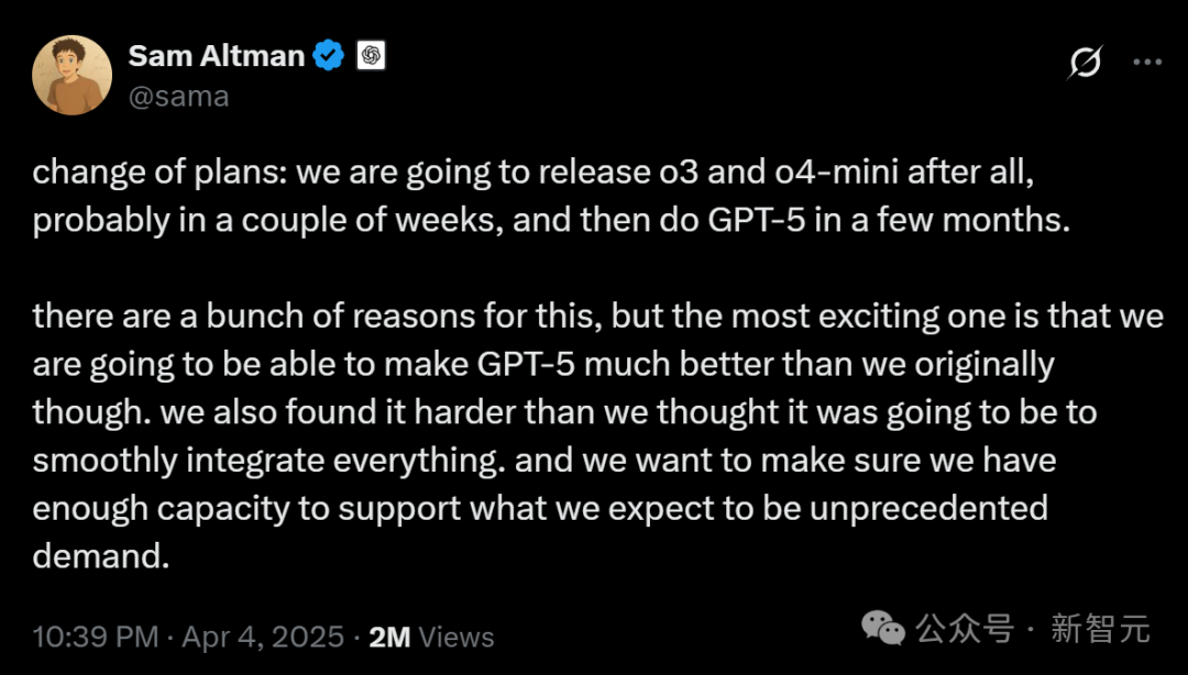 【新智元导读】刚刚,奥特曼接连抛出重磅消息:GPT-5不仅将免费开放,还将整合多项尖端技术。o3和o4-mini即将在几周内亮相,还有一个神秘的开源推理模型要来。然而,另一边Meta的Llama 4却因性能瓶颈屡次延期,AI竞赛的格局愈发扑朔迷离。