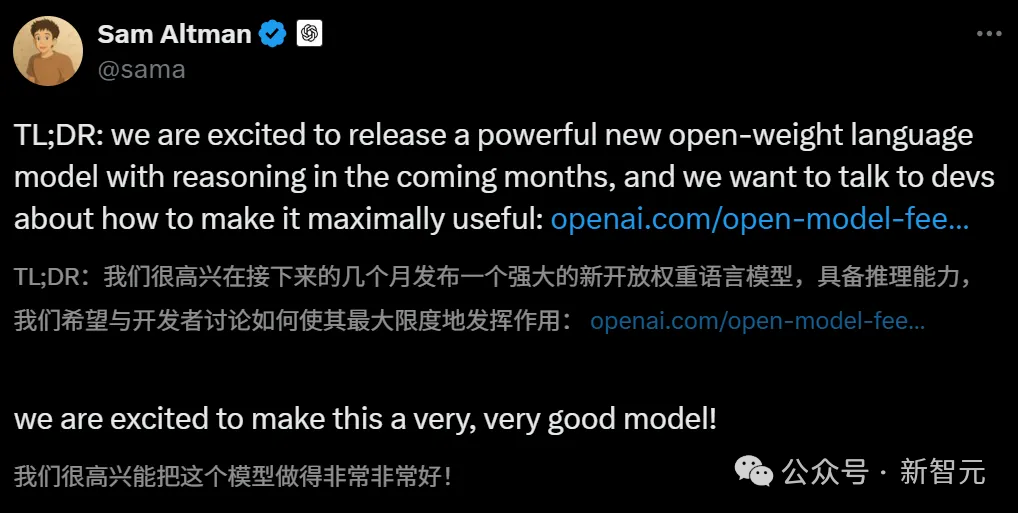 这个消息之所以让人如此激动,还有另外一层原因:就在几天前,奥特曼曾郑重官宣,OpenAI在未来几个月内,即将开源一款强大的推理模型。