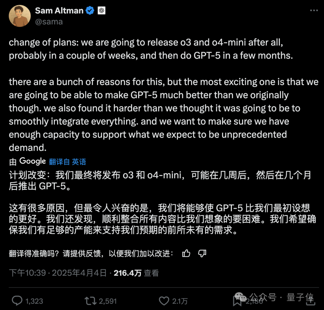 计划改变:我们可能在几周之后先发布o3和o4-mini。