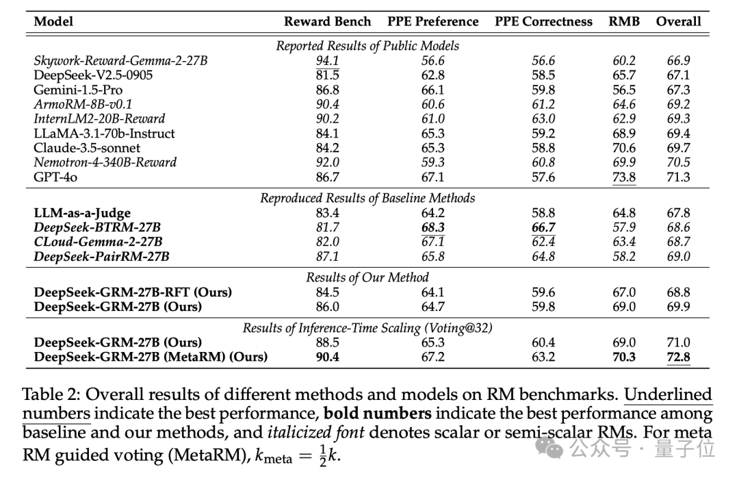 在Reward Bench、PPE、RMB等基准上,DeepSeek-GRM-27B显著优于基线方法(如LLM-as-a-Judge、标量RM),且通过推理时扩展(32次采样)性能进一步提升(如Reward Bench准确率从86.0%提升至90.4%)。