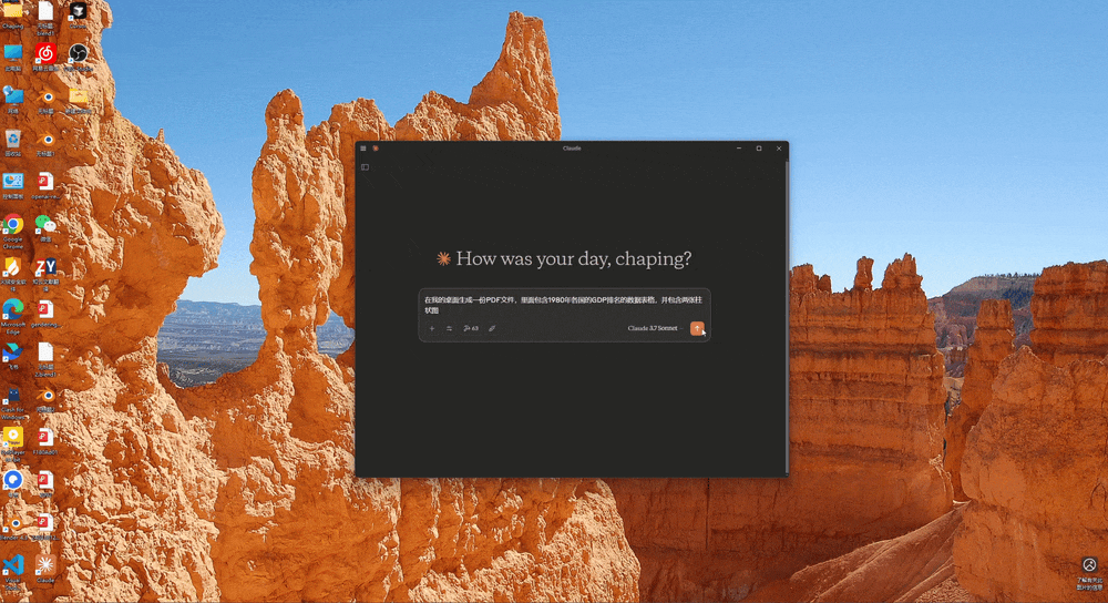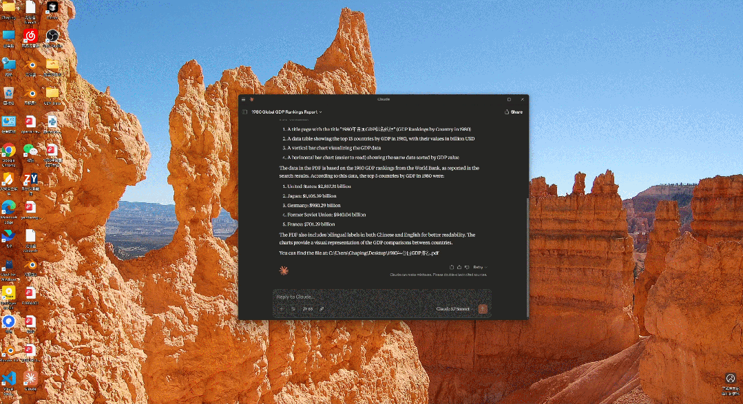 咱先从简单的开始,我直接告诉Claude:在我的桌面生成一份PDF文件,里面包含1980年各国的GDP排名的数据表格,并包含两张柱状图。