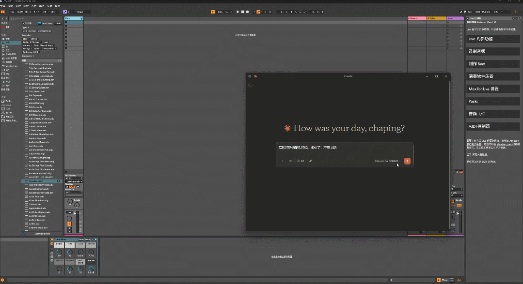 我直接跟它说:“给我写首歌,不需要贝斯。”(对不起,因为它写出来的贝斯实在太难听了。。 ) AI哥直接连上Ableton,就开始创建音轨、设置bpm、调整音色,编出了一段曲子,两个音轨,一个是钢琴,一个是提琴。你还别说,味道还挺对的。