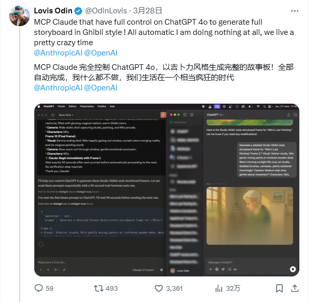 更逆天的是,有了MCP之后,各大语言模型之间,甚至能能协同工作了,比如让Claude操纵对手OpenAI的 GPT4o生个图,这种操作已经不是幻想了。