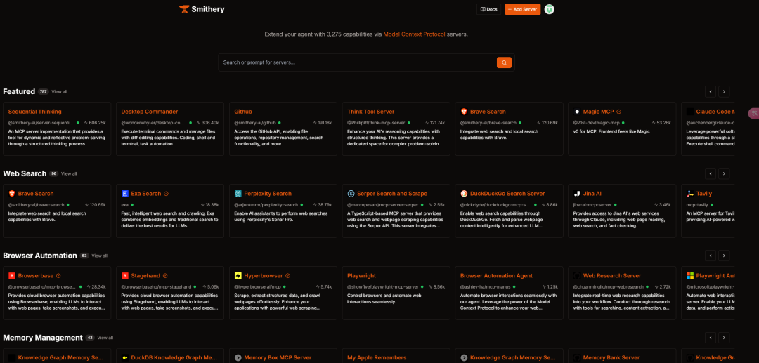 而现在,网上已经有MCP工具的超市了,各种功能的MCP Server应有尽有,包括百度地图、高德、MasterGo等等中大厂也在宣布接入。