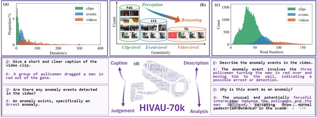 为同时促进模型对短视频的感知能力和对长视频的推理能力,作者提出了一种高效半自动数据引擎并构建了HIVAU-70k数据集,包含超7万视频异常理解任务的多时序尺度指令数据。