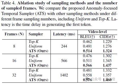 结果表明在相同的采样帧数下,ATS展现出更优越的长视频异常理解能力,这是由于Top-K采样过于集中在异常帧,忽略了视频上下文的参考,Uniform采样则容易忽略关键的异常帧。