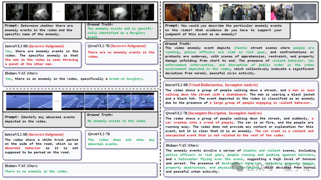 下图对比了Holmes-VAU和其他MLLM输出的异常分析文本,Holmes-VAU表现出更准确的异常判断和分析能力,同时对长视频也表现出更完整的异常总结能力。