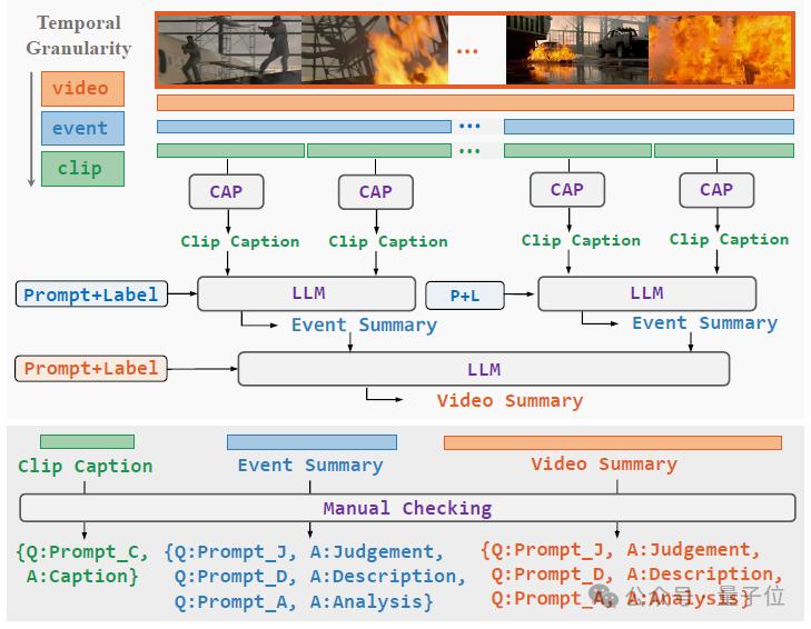 分层自由文本注释(Hierarchical Free-text Annotation):对于clip-level视频,使用人工或caption model得到clip caption;对于event-level视频,结合所包含的clip-level caption和异常类别,提示LLM得到事件总结;对于video-level视频,结合所包含的事件总结和异常类别,提示LLM得到视频总结;