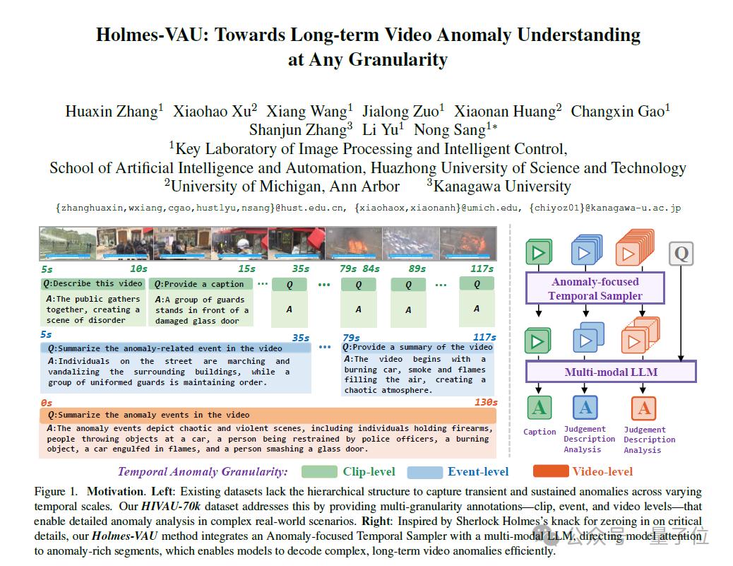 来自华中科大等机构的研究人员,提出了新的视频异常理解模型Holmes-VAU,以及相关数据集。