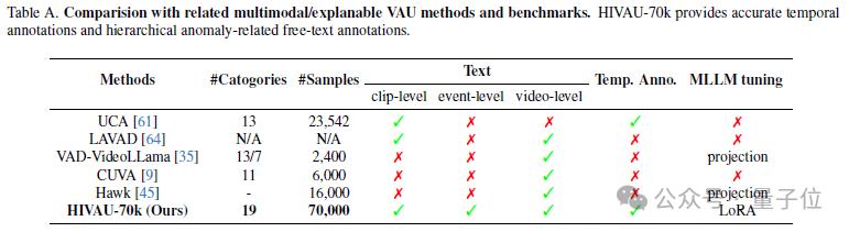 与其他相关的数据集相比,HIVAU-70k不仅有数量上的优势,还提供了多粒度的文本标注以及时序上的异常边界标注。