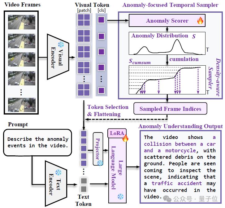 同时作者提出了一种基于异常分数的时序采样器,从长视频中动态稀疏采样关键帧到后续多模态大模型中,显著提升了异常分析的准确性和推理效率。