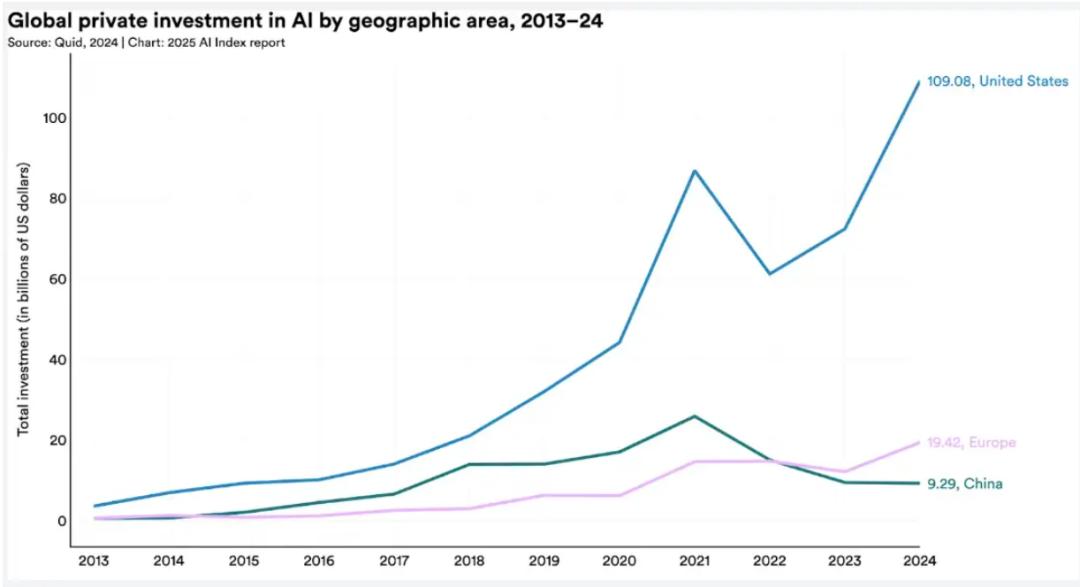 2024年美国私营领域AI投资高达1090亿美元,几乎是中国(93亿美元)的12倍、英国(45亿美元)的24倍。