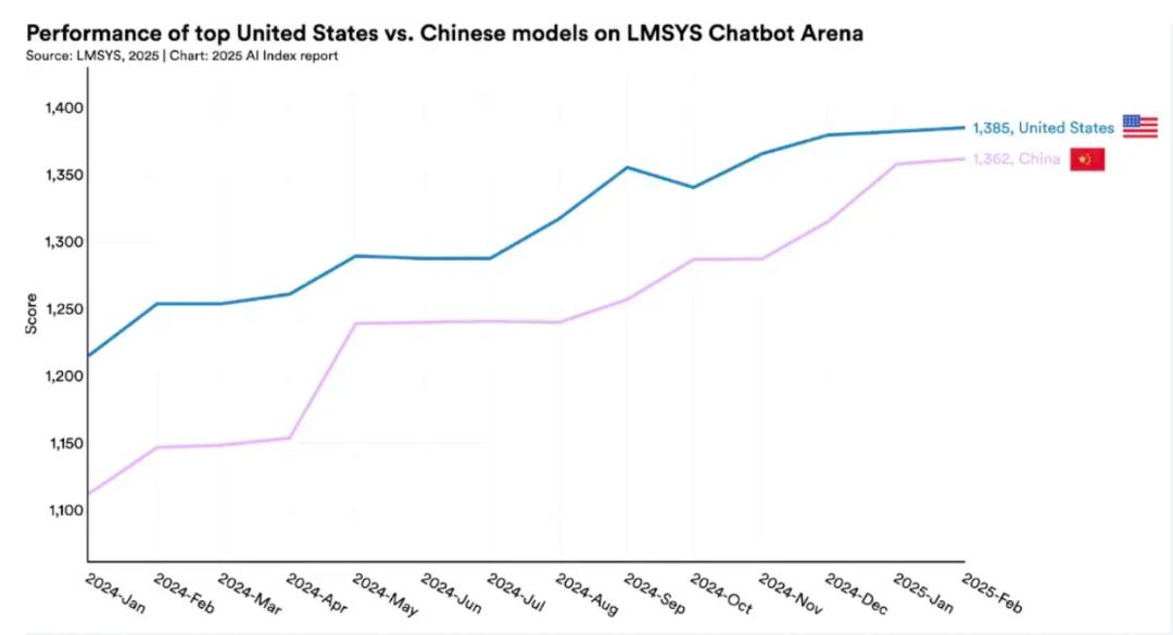 在MMLU、HumanEval等核心基准测试中,中美模型性能差距已从2023年的两位数百分比缩小至2024年的毫厘之间。中国在AI论文发表量和专利数量上持续领跑全球。