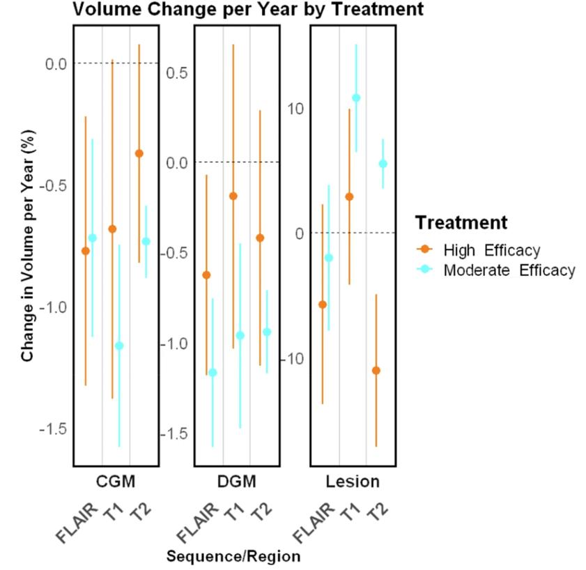 随后,研究人员进行了针对病变治疗效果的纵向验证,涉及多项实验,证明了 MindGlide 在治疗效果检测方面的有效性,如在 SPMS 和 PPMS 试验中,治疗组的病变体积累积量低于安慰剂组;在儿科队列中,MindGlide 成功检测了不同治疗组中病变体积的不同变化,如下图所示。