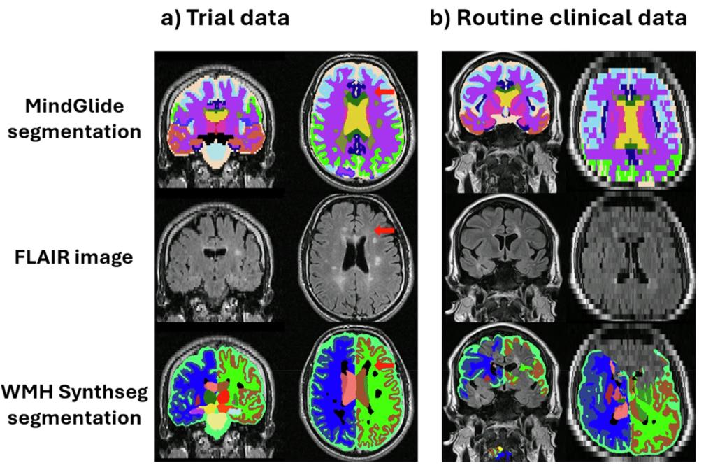 其中,图 (b) 显示了常规护理临床数据集 (RRMS) 中的一个厚度为 7mm 的切片,WMH-Synthseg 分割失败。这是因为大多数分割工具被设计为使用优劣采集方向,而 MindGlide 允许对任何方向获取的图像进行分割。
