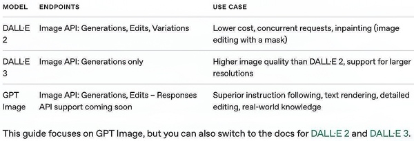 ▲图为gpt-image-1模型、DALL·E 2和DALL·E 3的端点以及用例。