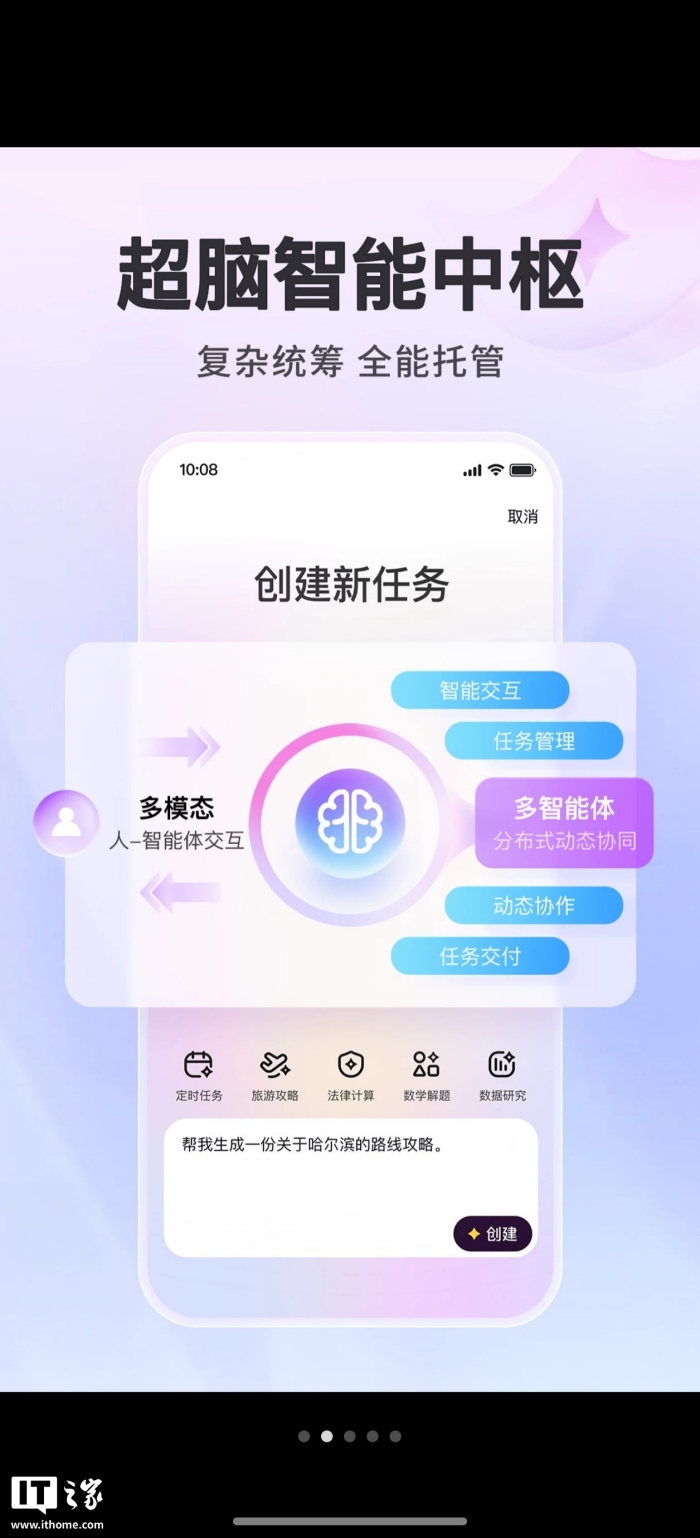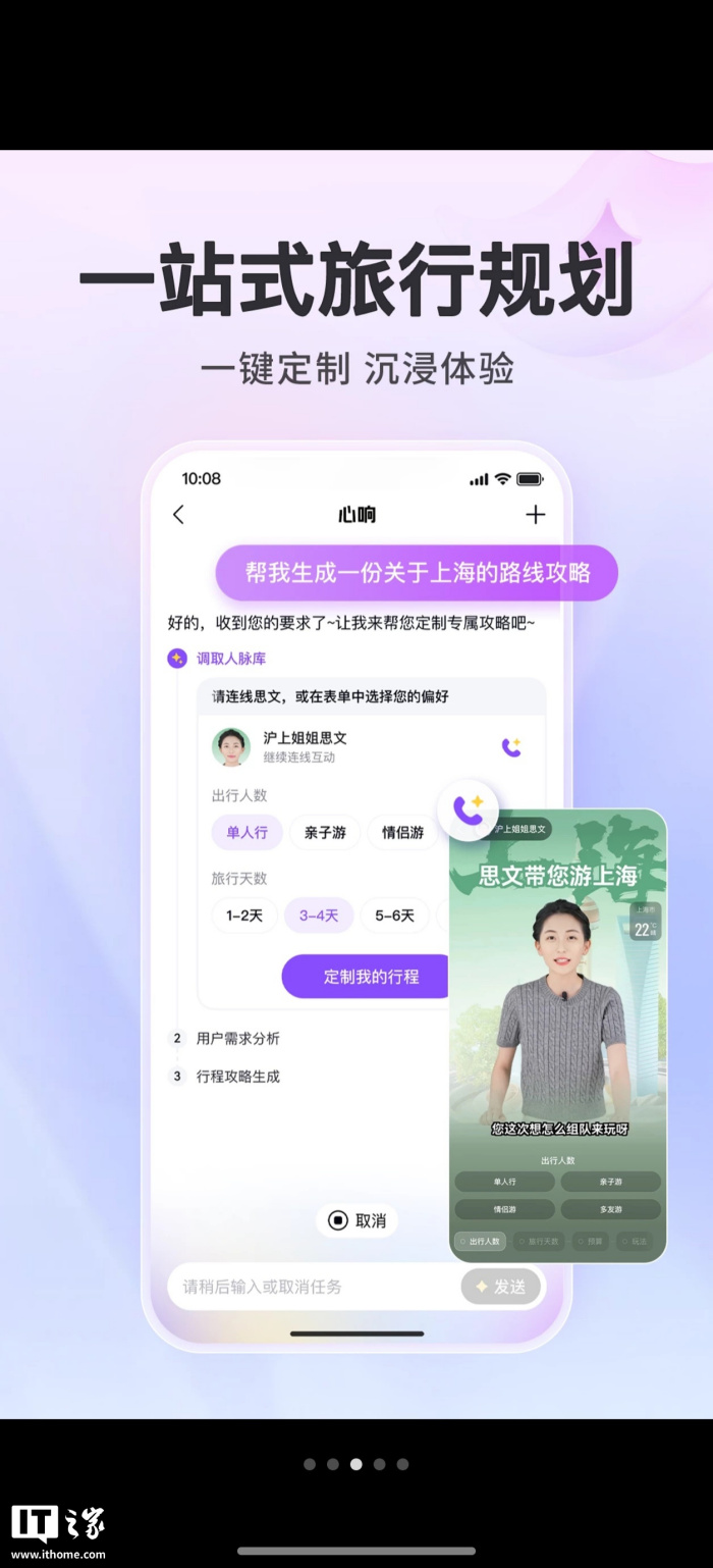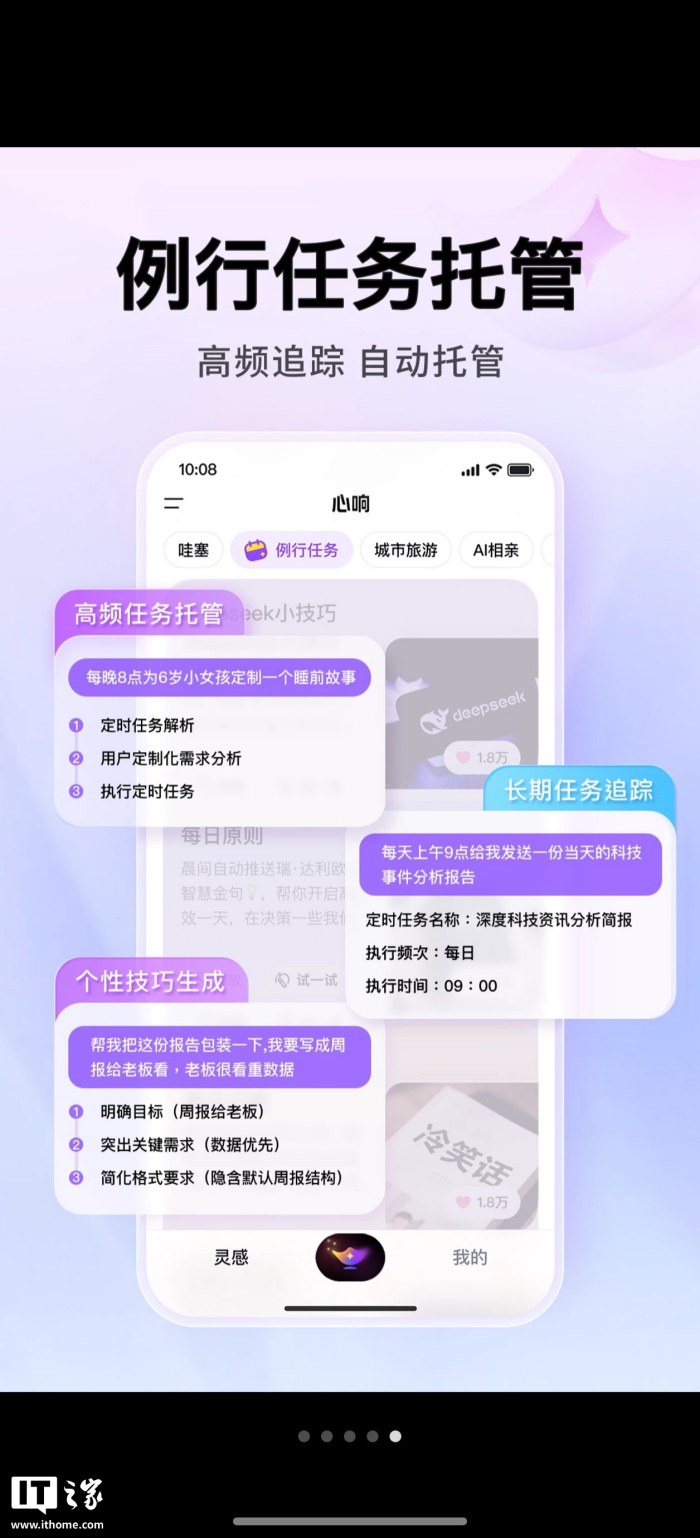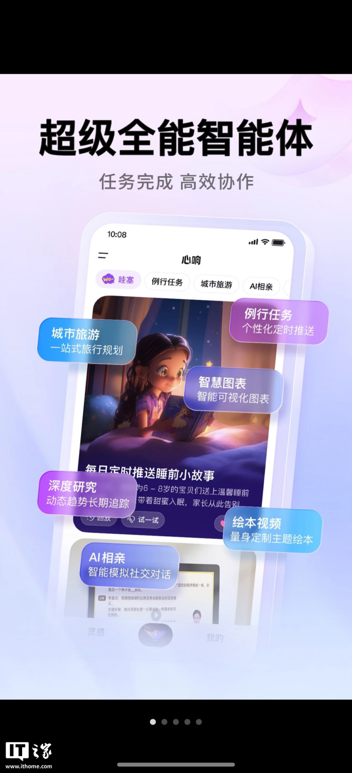 目前,心响 App 已上线了包括例行任务、城市旅游、AI 相亲、深度研究、法律咨询、健康咨询、智慧图表、试题讲解、AI 绘本、游戏开发在内的十大场景超 200 个任务类型,未来计划将任务类型扩展到 10 万以上。