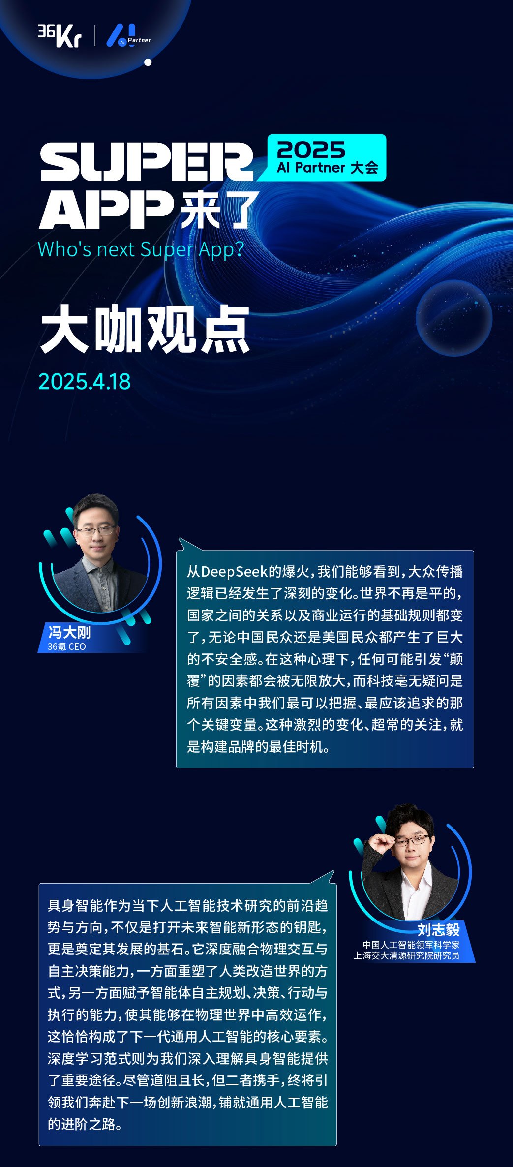 2025年4月18日,36氪2025 AI Partner大会在上海模速空间成功举办。本届大会以“Super App来了” 为主题,围绕 “Super App来了” 和 “谁是下一个超级应用” 两大核心议题,汇聚人工智能领域的专家学者、科技巨头高管及行业先锋,共同探讨AI如何重构商业逻辑、重塑产业生态,并挖掘下一代超级应用的无限可能。