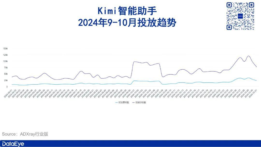在其他大模型厂商还在深耕技术时,Kimi在2024年就进行了大规模市场推广,据钛媒体数据显示,截至10月29日,Kimi智能助手当月全网广告投放金额高达1.99亿元。
