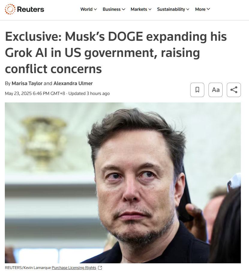 IT之家 5 月 23 日消息,据路透社援引三位知情人士消息称,亿万富翁埃隆・马斯克的 DOGE 团队正推动其 AI 聊天机器人 Grok 在美国联邦政府的数据分析工作中落地使用。这种做法可能违反利益冲突相关法律,并让数百万美国公民的敏感信息面临泄露风险。