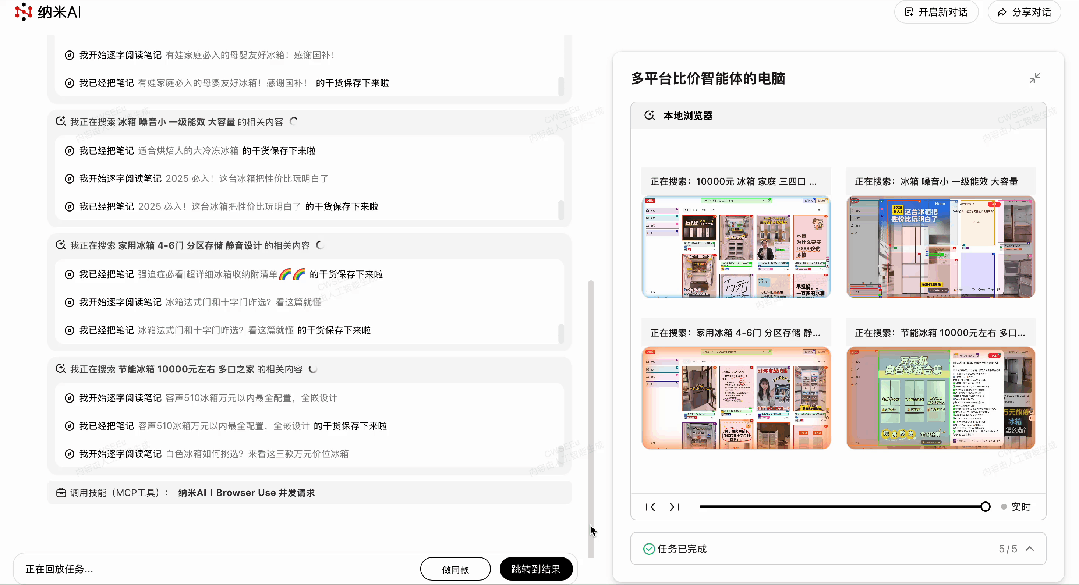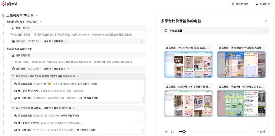 纳米AI超级搜索就快速分析个人的真实需求,并快速调用MCP万能工具箱,串联比价、购物、加购任务,4个AI同时打开浏览器阅读种草笔记、购买攻略,一键接管繁琐流程,效率提升400%。