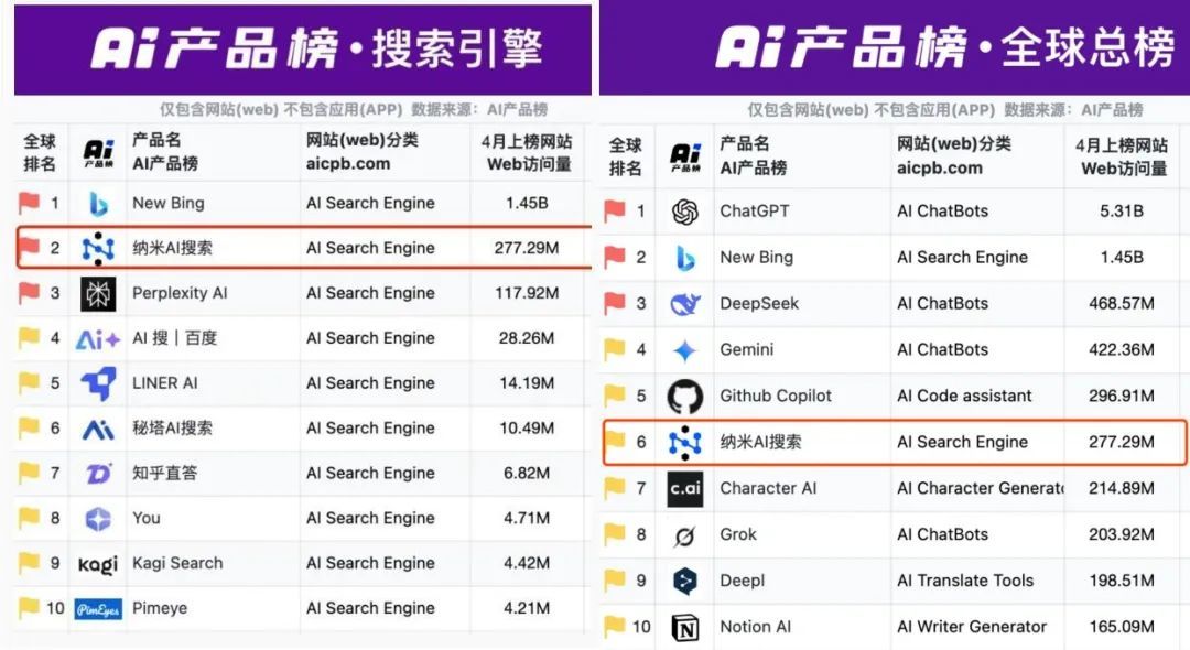 如果拉长时间维度,自去年发布以来,纳米AI搜索的访问量持续走高。有第三方数据显示,其发布首日访问量超100万,并快速上升至苹果App Store效率榜前20 位。当月的月访问量就超3亿次,是同时期Perplexity AI的三倍以上,成为全球访问量最大的AI原生搜索引擎之一。