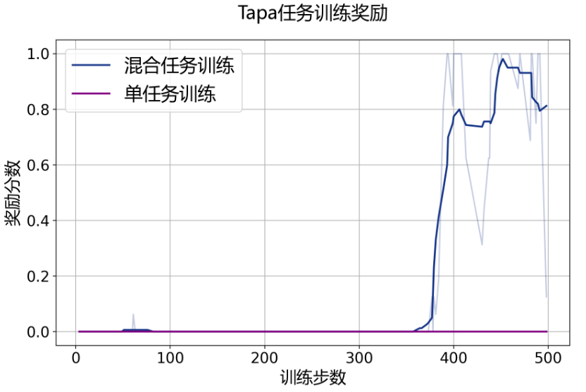 在单一任务中,无法成功推理得到奖励的模型,通过多个任务混合的强化学习,能够在训练过程中成功得到奖励,实现领域外专业任务的有效强化学习训练。