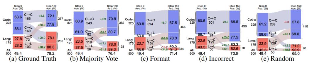 错误奖励:故意提供错误的监督,只奖励错误答案,即先用多数投票法标注所有训练数据,选择错误标签的子集进行训练,并给予对应的响应奖励。