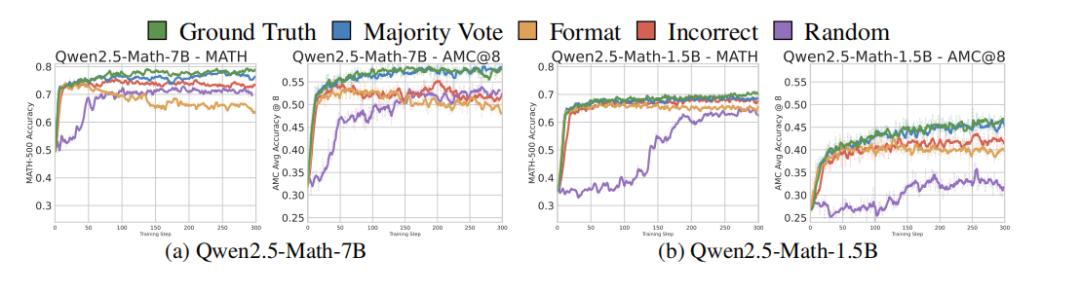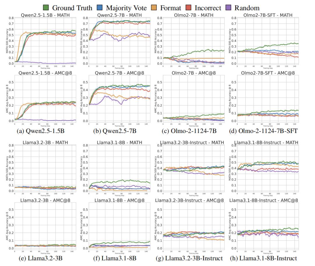 实验结果表明,与未调优的基线模型相比,所有奖励函数(即使是设计上存在问题的函数),均能在所有基准测试的前50步内显著提升数学推理性能。