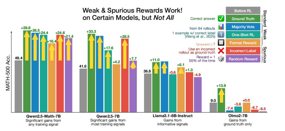 值得注意的是,虚假奖励带来的性能提升,与基于真实标签的RLVR提升幅度,相差只有几个百分点。