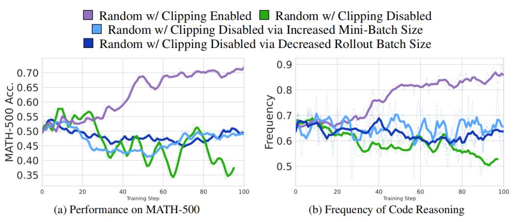 此外,通过分析随机奖励也能提升性能的特殊情况,研究人员还发现一个有趣的结论:GRPO的裁剪偏差可能会诱导随机奖励生成有益的训练信号,增加代码推理行为,从而实现性能提升。