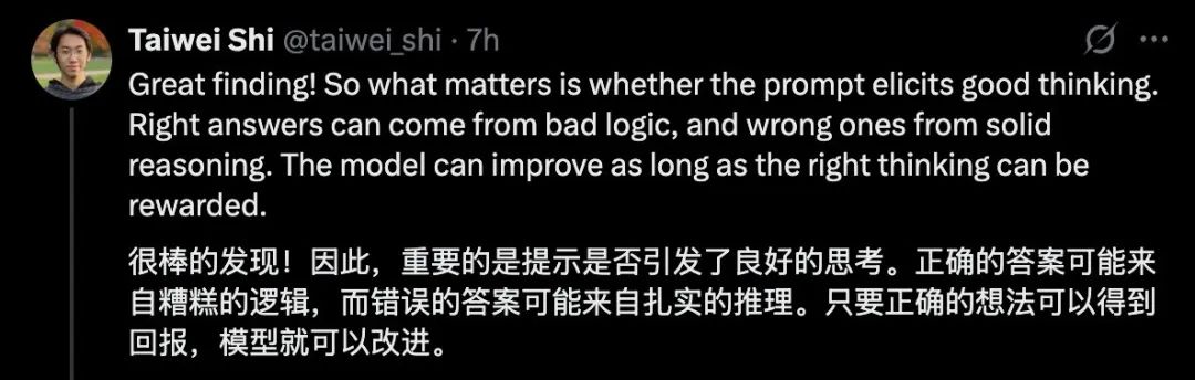 而当论文作者Stella Li在X上发帖介绍自己的论文时,我们注意到评论区有这样一位网友的留言,他指出在模型改进中,也许「结果不重要,推理过程才重要」