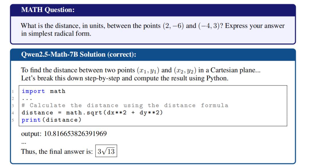 Qwen2.5-Math-7B频繁生成Python代码辅助思考过程 (占所有回答的 65.0%),尽管无法执行,但这种代码推理行为在一定程度上,与答案准确率高度正相关。
