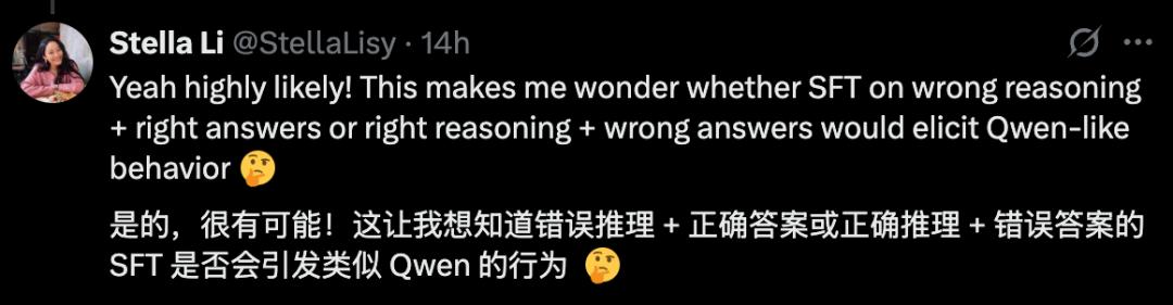 Stella Li的回复也提出了另外一种可能,也许错误推理+正确答案或者正确推理+错误答案,可能也会帮助OLMo2-7B-SFT实现类似Qwen在虚假奖励下的性能增益。