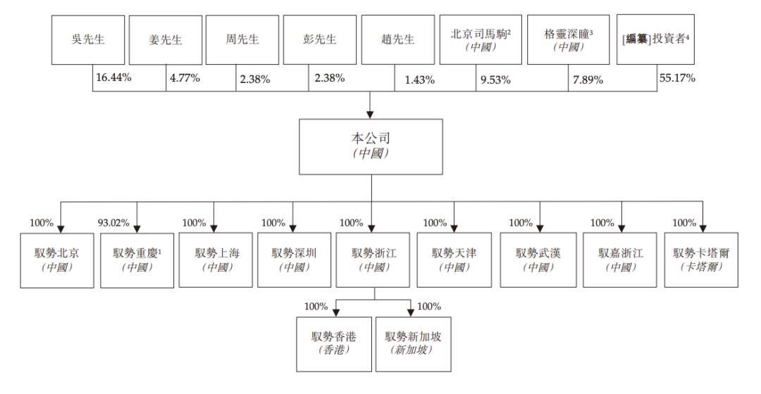 IPO前,吴甘沙持股16.44%,姜岩持股4.77%,周鑫、彭进展分别持股2.38%,赵勇持股1.43%;员工持股平台北京司马驹持股为9.53%,北京司马驹由吴甘沙(其普通合伙人)实益拥有18.53%权益,及吴甘沙及周鑫(其有限合伙人)代表购股权承授人拥有61.47%及20%权益。