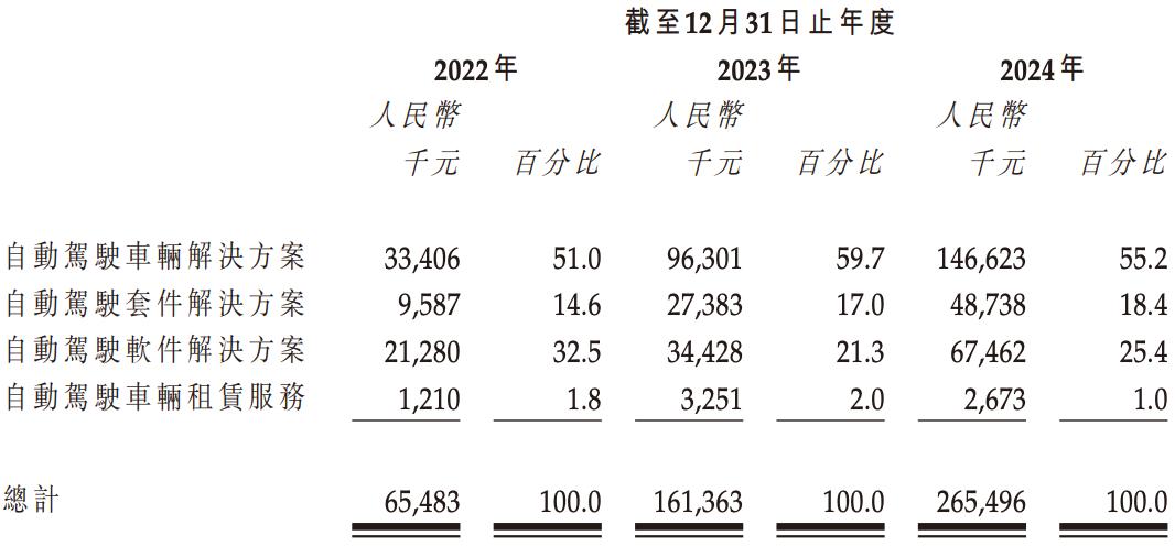 其中,以业务线划分,2024年来自自动驾驶车辆解决方案收入为1.47亿元,占比55.2%,为最大头;来自自动驾驶套件解决方案收入为4874万元,占比18.4%;来自自动驾驶软件解决方案收入为6746万元,占比25.4%;租赁服务则只有267.3万元,占比1%。