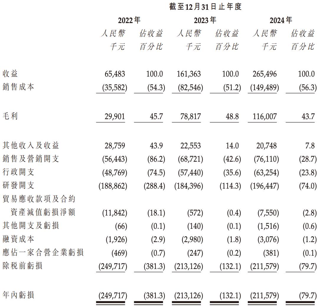 收入上涨的同时,驭势科技的毛利率也处于较高水平,2022年、2023年及2024年分别为45.7%、48.8%、43.7%。