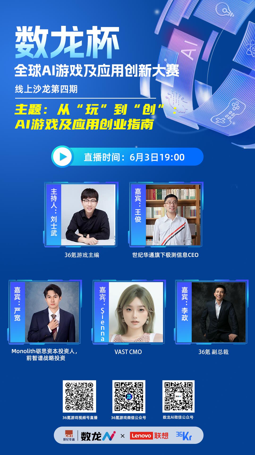目前,数龙杯线上沙龙已成功举办三期,第四期计划于6月3日晚7点以线上直播的形式进行。此次,36氪邀请了世纪华通旗下极测信息CEO王俊、Monolith砺思资本投资人严宽、3D技术开发厂商VAST的CMO Sienna以及36氪副总裁李政四位嘉宾,一起围绕“AI游戏及应用创业”展开讨论。