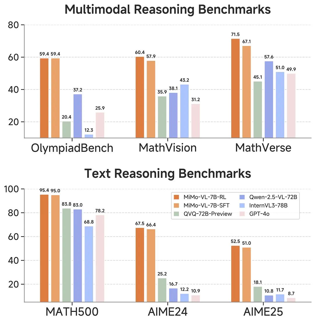 MiMo-VL-7B 在保持 MiMo-7B 纯文本推理能力的同时,在多模态推理任务上,仅用 7B 参数规模,在奥林匹克竞赛(OlympiadBench)和多个数学竞赛(MathVision、MathVerse)大幅领先 10 倍参数大的阿里 Qwen-2.5-VL-72B 和 QVQ-72B-Preview,也超越闭源模型 GPT-4o。