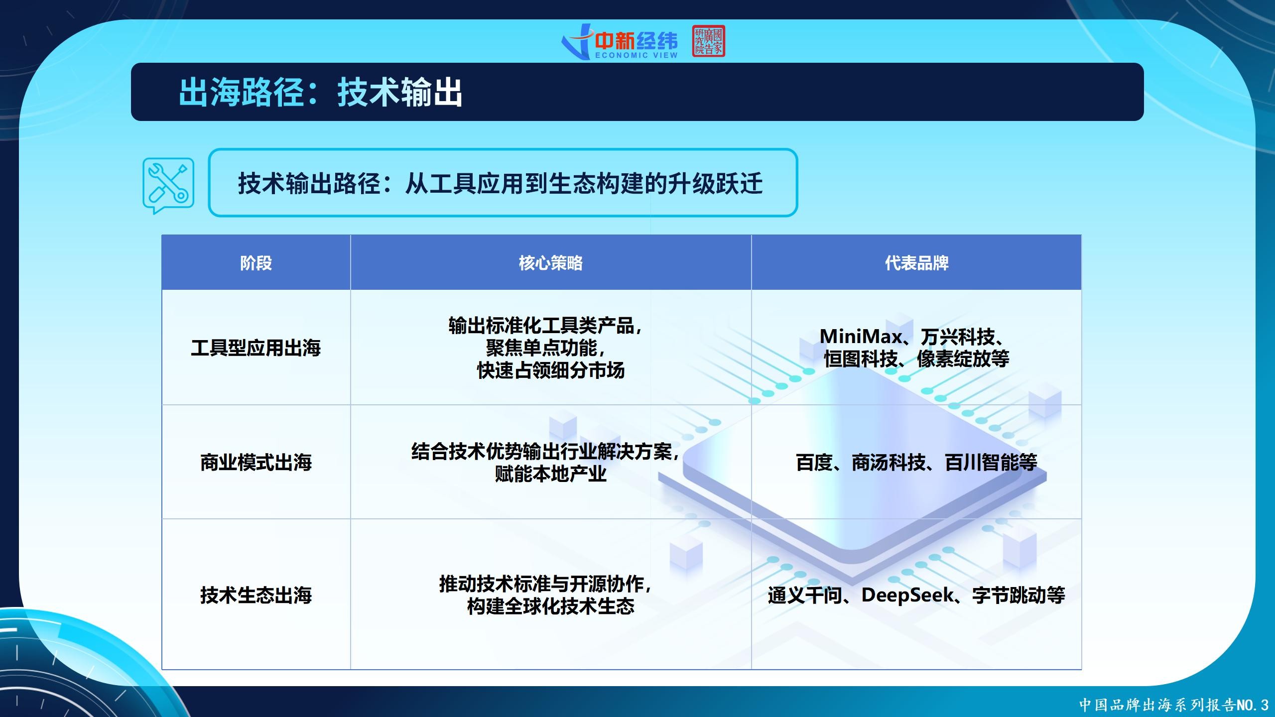 根据《报告》,AI出海的技术输出分三个发展阶段:一是工具型应用出海,其核心策略是输出标准化工具类产品,聚焦单点功能,以快速占领细分市场;二是商业模式出海,核心策略是结合技术优势输出行业解决方案,赋能本地产业;三是技术生态出海,核心策略是推动技术标准与开源协作,构建全球化技术生态。