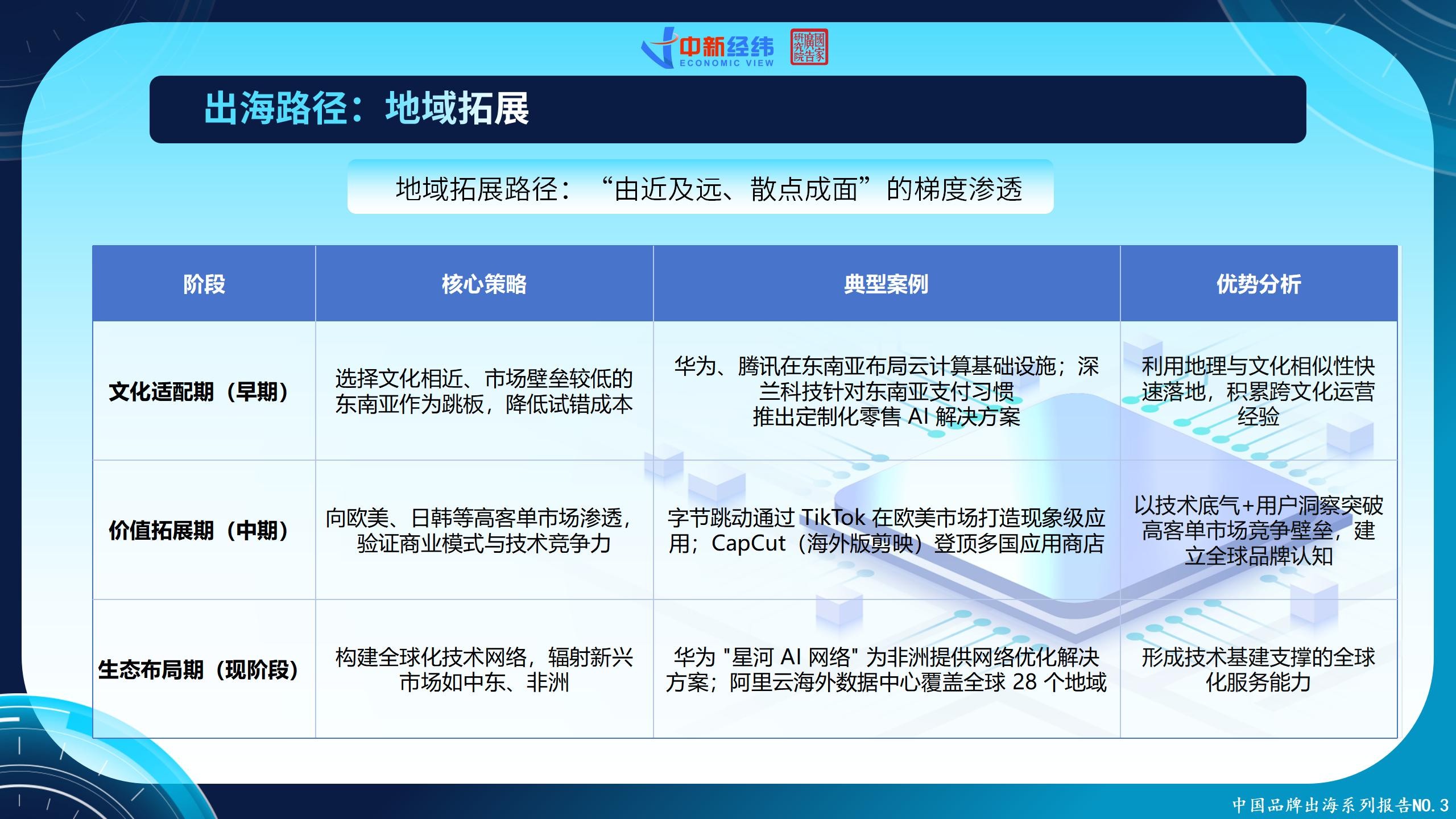 在地域拓展路径方面,《报告》指出,AI出海呈现“由近及远、散点成面”的梯度渗透特征。文化适配期(早期)阶段主要是利用地理与文化相似性快速落地,积累跨文化运营经验,一般会选择文化相近、市场壁垒较低的东南亚作为跳板,降低试错成本;价值拓展期(中期)则以技术底气+用户洞察突破高客单市场竞争壁垒,建立全球品牌认知,向欧美、日韩等高客单市场渗透,以验证商业模式与技术竞争力;至生态布局期(现阶段),企业已形成技术基建支撑的全球化服务能力,构建全球化技术网络,辐射新兴市场如中东、非洲。