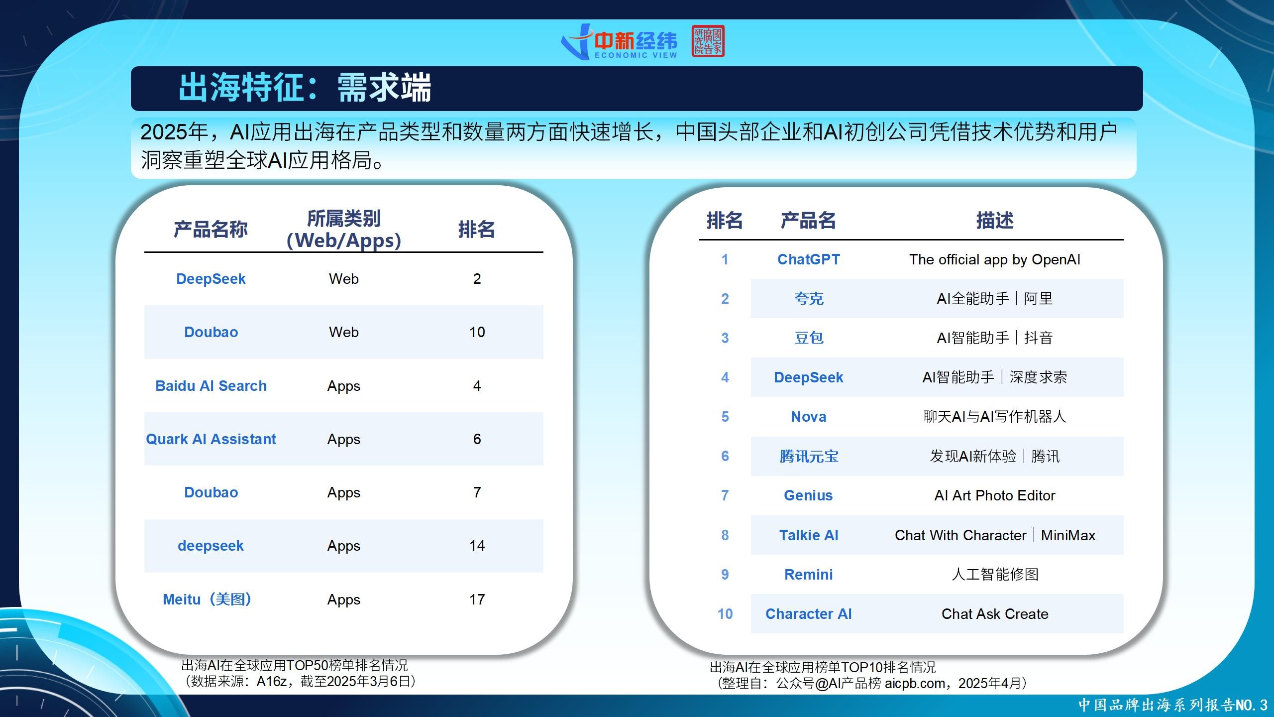 《报告》指出,从技术端来看,中国AI产品出海具备显著优势。海量用户、复杂的应用场景及多元化的社会需求,催生了丰富的AI创新应用场景;高质量的数据积累与数据闭环迭代机制,为AI产品化提供助力。同时,中国AI企业的API(应用程序编程接口)较国外同类产品更低,为商业化落地提供了价格竞争力。从需求端来看,“用户洞察”与“本地化产品创新”同步发力,推动了AI应用市场爆发式增长。A16z的数据显示,截至2025年3月6日,出海AI产品在全球应用TOP50榜单中,DeepSeek排名第二。