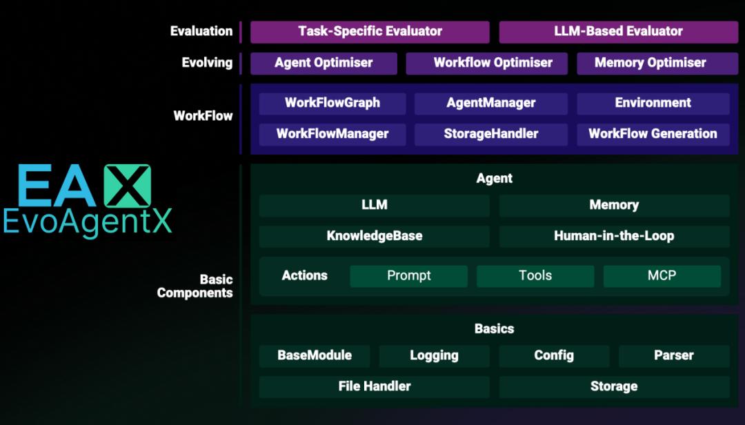 通过整合建模、执行与反馈链路,EvoAgentX不仅让智能体系统的搭建更轻,更快,也为其演化能力奠定了基础。无论是科研探索还是原型开发,它都能作为核心工具链,帮助用户高效验证策略设计与协同机制,加速多智能体能力从「可用」走向「可靠」。