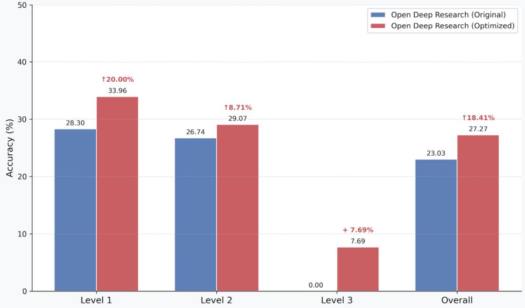 为了进一步验证 EvoAgentX 在优化现有AI智能体工作流方面的能力,该框架也优化GAIA基准测试上现有的多智能体系统,包括了GAIA排行榜中开源且可复现的代表性多智能体框架:Open Deep Research